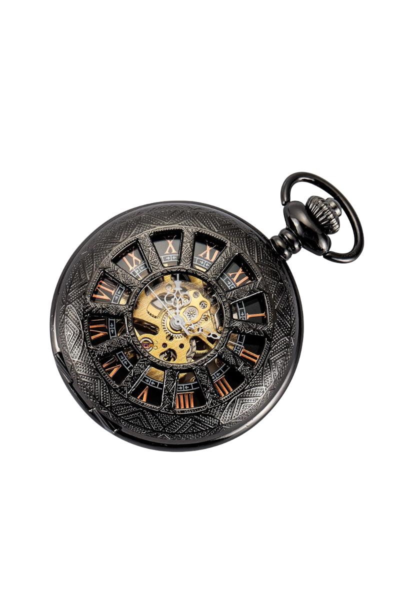 Classic in soul, modern in spirit — the Velocità Nera is a bold reimagining of the traditional pocket watch, where elegance meets innovation. Housed in a black half-hunter case, this mechanical masterpiece invites admiration without needing to be opened. Its twelve-window skeleton design lets you read the time at a glance, while offering a teasing view into the intricate heart of its movement.